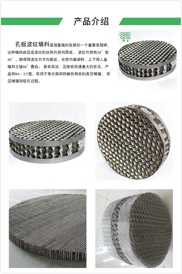 重點介紹金屬絲網(wǎng)波紋包裝,它是波紋包裝的主要方式,主要由金屬絲網(wǎng)制成,較常用的有不銹鋼、碳鋼、鋁、銅等,當然也可根據(jù)客戶需要選擇其他材料。雖然波紋金屬絲網(wǎng)填料的成本相對較高,但由于其分離能力強、比表面積大、空位率高、阻力小等優(yōu)點而得到廣泛應(yīng)用,特別是用于精細蒸餾和真空蒸餾設(shè)備,以及熱敏性材料的蒸餾。